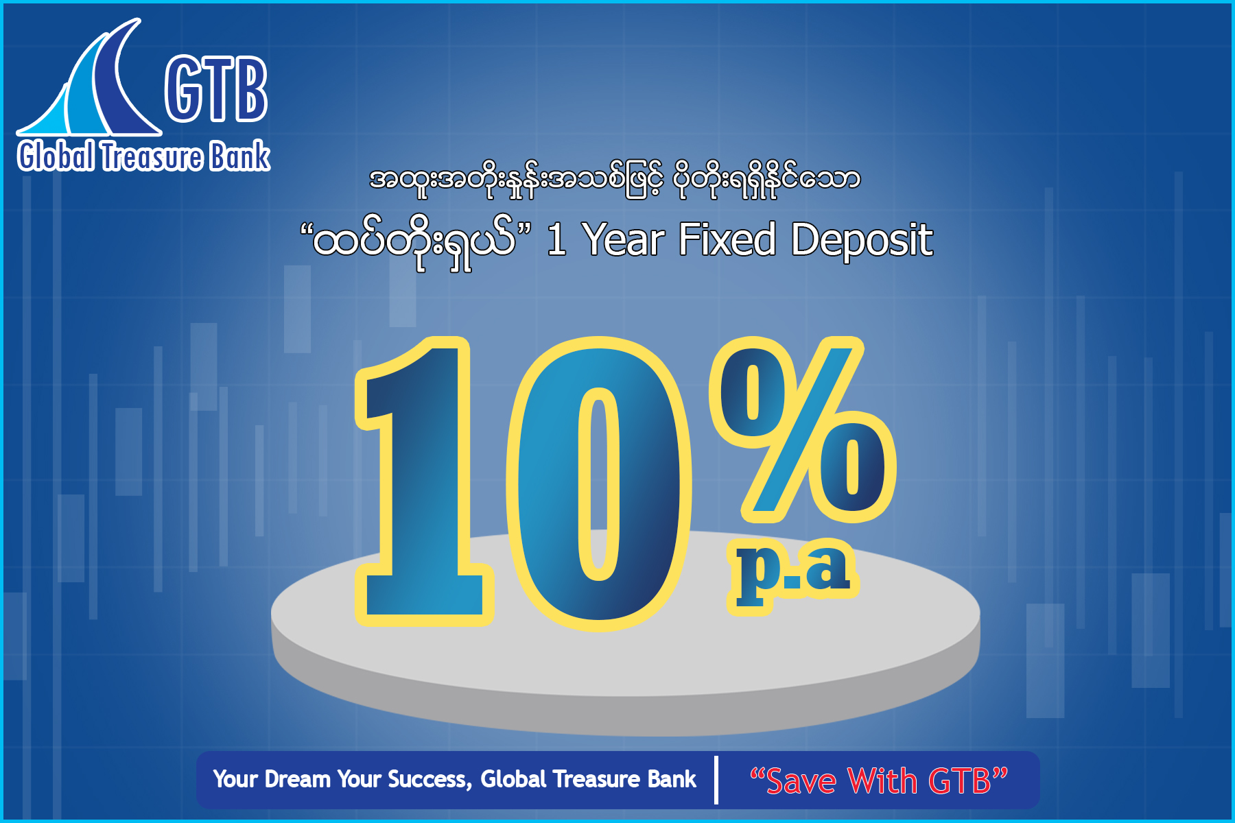 အထူးအတိုးနှုန်းသစ်ဖြင့် 10% ထိ ပိုတိုးရရှိနိုင်သော‘ထပ်တိုးရှယ်’ 1 Year Fixed Deposit GTB ဘဏ်မှ အမြဲတန်ဖိုးထားရသော Customer များအားလုံးအတွက် ပိုမိုတိုးပွား အကျိုးခံစားရမည့် ‘ထပ်တိုးရှယ်’ 1 Year Fixed ကို တစ်နှစ်ပေါ်အခြေခံသော အမြင့်ဆုံးအတိုးနှုန်းသစ် (10%) ဖြင့် (၁၆.၁၁.၂၀၂၁) ရက်နေ့မှ (၁၀.၁၂.၂၀၂၁) ရက်နေ့အထိ သတ်မှတ်ကာ Promotion အစီအစဉ် ပြုလုပ်ဝန်ဆောင်မှုပေးနေကြောင်း ဦးစွာ အသိပေးလာရောက် ဝန်ဆောင်မှုရယူဖို့ ဖိတ်ခေါ်အပ်ပါသည်။Promotion အစီအစဉ်တွင် (၁ နှစ် နှင့် ၆ လ) (၂)မျိုးရှိမည်ဖြစ်ပြီး ငွေသားဖြင့် အပ်နှံခဲ့သူများကို ကာလစေ့ရောက်သောအခါ အတိုးရော အရင်းပါ ငွေသားဖြင့် ထုတ်ပေးမည်ကို အာမခံသည့်အပြင် အမြင့်ဆုံး အတိုးနှုန်းဖြစ်သော ၁၀% p.a ကိုလည်း ခံစားခွင့်ရှိပါသည်။ ထို့ပြင် အောက်ပါ A/C များမှလည်း Special Fixed Deposit ကို လာရောက်ဝန်ဆောင်မှုရယူနိုင်ပါသည်။ - A/C Transfer Only (Other Bank) - GTB သက်တမ်းစေ့ရောက်သည့် Old Fixed Deposit to Special Fixed Deposit(အထက်ပါ A/C အမျိုးအစားများကို စုဆောင်းထားလျှင်လည်း သတ်မှတ်ကာလပြည့်ပါက အတိုးငွေကို ငွေသားဖြင့် ထုတ်ပေးမည်ဖြစ်ကြောင်းကို အာမခံပါသည်) GTB ဘဏ်၏ ပိုမိုတိုးပွားမည့် ‘ထပ်တိုးရှယ်’ Promotion အစီအစဉ်ကို Customer များမှ မိမိတို့၏ နီးစပ်ရာ GTB ဘဏ်ခွဲများတွင် အမြန်ဆုံးလာရောက် ဝန်ဆောင်မှုများရယူနိုင်ပြီဖြစ်ပါကြောင်း ချစ်ခင်လေးစားစွာဖြင့် အသိပေးကြေညာအပ်ပါသည်။